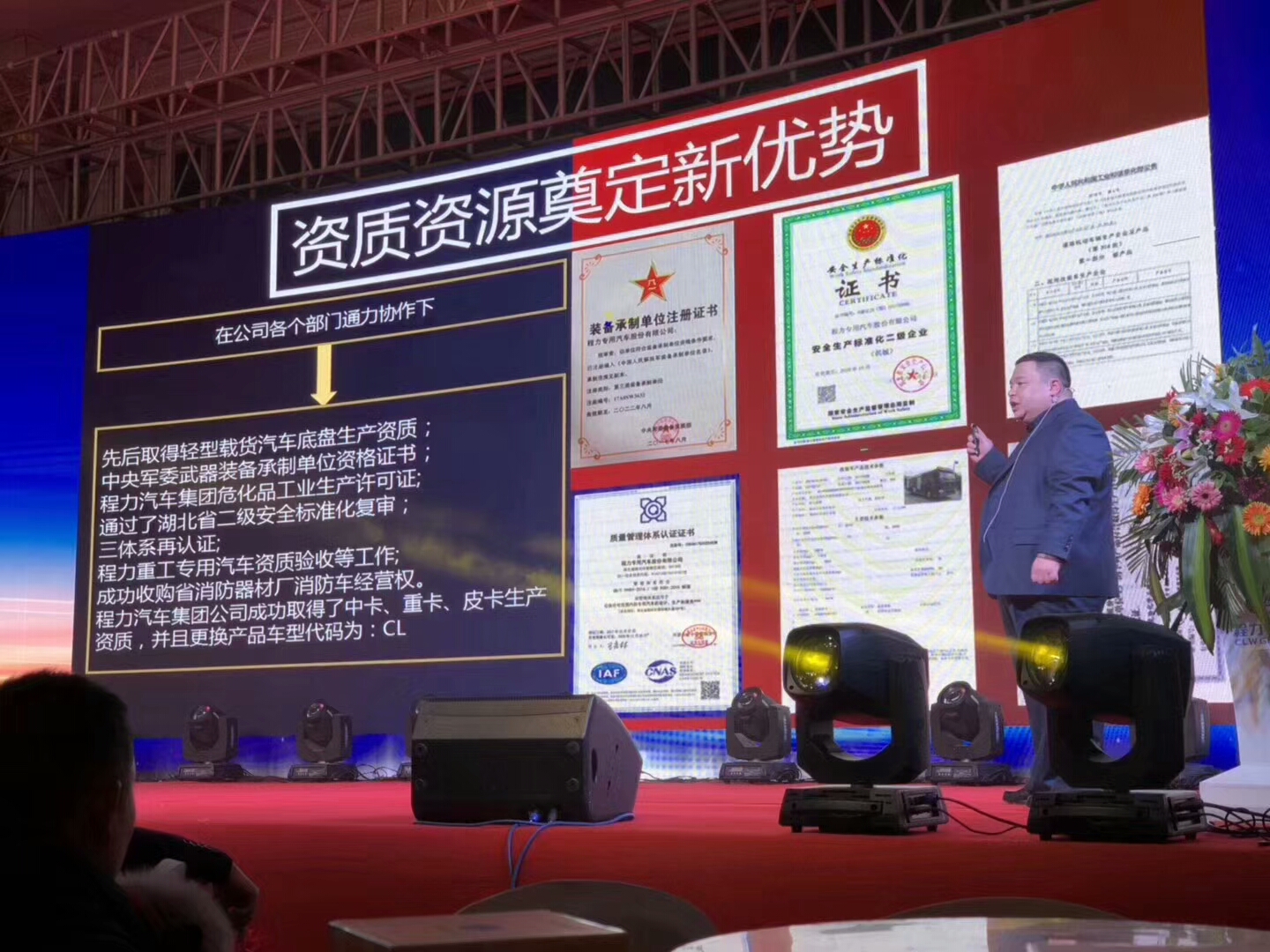 在公司各個部門通力協作下,先后取得輕型載貨汽車底盤生產資質;中央軍委武器裝備承制單位資格證書;程力汽車就團危化品工業生產許可證;通過了湖北省二級安全標準復審;三體系在認證;程力重工專用汽車資質驗收等工作;成功收購省消防器材廠消防車經營權;程力汽車集團公司成功取得了重卡、重卡資質,并且跟換產品車型代碼:CL