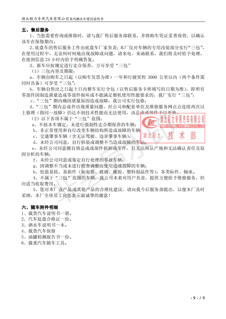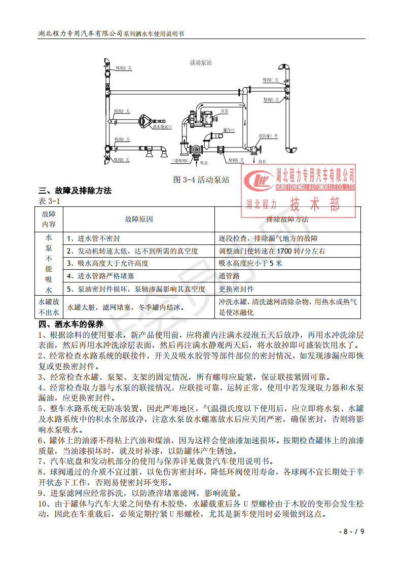 湖北程力專業(yè)生產(chǎn)東風(fēng)小霸王灑水車、東風(fēng)多利卡灑水車、東風(fēng)灑水車、東風(fēng)大金剛灑水車、東風(fēng)140灑水車、東風(fēng)140/47灑水車、東風(fēng)145灑水車、東風(fēng)153灑水車、東風(fēng)1254灑水車、東風(fēng)前四后八灑水車、東風(fēng)天龍灑水車、半掛灑水車、解放系列灑水車、汽油灑水車等各類灑水車。用戶可自帶底盤我廠提供上裝部件的生產(chǎn)改裝。 灑水車前沖(噴)后灑,帶側(cè)噴,罐體后帶工作平臺,平臺上安裝綠化灑水炮,灑水炮可全方位旋轉(zhuǎn),可連續(xù)調(diào)成直沖狀、大雨、小雨、毛毛雨,帶安全護欄,配備全國質(zhì)量評比第一名的杭州威龍大功率專用灑水泵,泵可自吸自排,安裝過濾網(wǎng),帶消防接口,可通過消防栓進水,帶自流閥,隨車選裝20米綠化卷盤,可噴灑農(nóng)藥,罐體金屬漆。 灑水泵情況說明:大功率專用灑水泵,采用國際領(lǐng)先意大利技術(shù),在國內(nèi)生產(chǎn)各系列專用泵已有50年歷史,產(chǎn)品質(zhì)量成熟可靠,設(shè)計先進合理,使用方便快捷,比同類灑水泵壓力大、吸程遠、使用壽命長,克服其它灑水泵易被雜物纏住、壓力小、吸水慢的缺點,引領(lǐng)國內(nèi)外灑水泵行業(yè)標(biāo)準(zhǔn),市場占有率93%。關(guān)于湖北程力灑水車使用說明書介紹如下,用戶不清楚可以直接打印出來。 ![]() ![]() ![]() ![]() ![]() ![]() ![]() ![]() ![]() |
