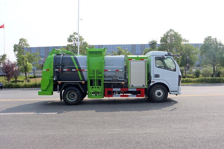 底盤電池提供動力,永磁同步電機驅動,可根據需要實時調速,取力操作與底盤行駛系統無任何關聯,用車體驗感極佳。程力牌東風凱普特新能源純電動5方餐廚垃圾車改裝配置:優質高強度 Q345 錳鋼制作無泄漏箱體,標配:1.弧形罐體,邊四底五/邊五底六。2.長源/皖液油泵,長源/中梅多路閥,知名液壓油缸。3.全推鏟卸料(不帶舉升功能),具有干濕分離功能。液壓后蓋,后蓋配防腐硅膠密封條。4.后門液壓鎖緊5.鏈條式提升機,可掛120/240升標準塑料垃圾桶。進料口蓋液壓開關。6.駕駛室內電控(提升機外部手動控制),后門鎖緊與后蓋開關的操作具有防誤操作。7.箱體帶清洗裝置(液壓馬達帶動高壓泵、帶水箱)。