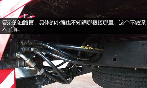 平時不工作的時候,貨藍垂直放下,使用時,把貨藍直接水平支撐起來。里面的黑色管路專門用于支撐貨藍的小液壓油缸。
