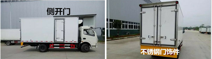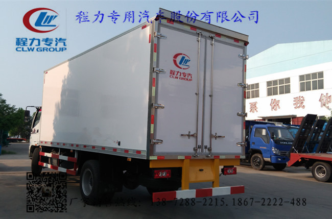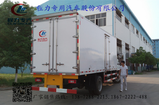 2.上裝配置:冷藏廂體內部有效尺寸:長6.09米×寬2.17米×高2.21米,采用內外玻璃鋼,隨客戶選擇內置槽鋼焊接骨架或者玻璃纖維超輕高強度骨架,填充8cm聚氨酯保溫層,不銹鋼包角,不銹鋼門框,不銹鋼門鎖件,防滑花紋鋁底板,配后雙開門,車廂右側可以加開側門,-5度或者-18度制冷機組,選裝T型材通風槽,導軌,肉鉤