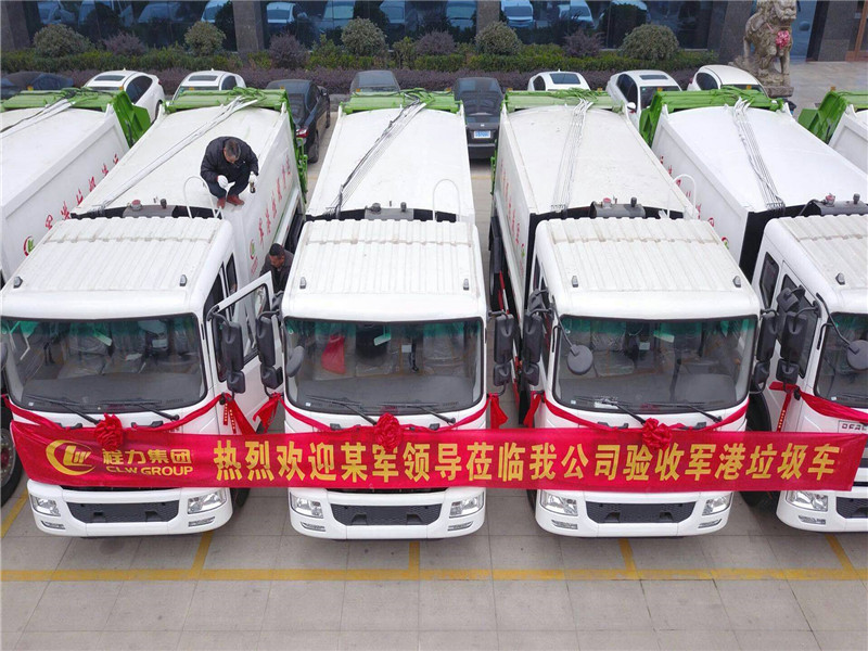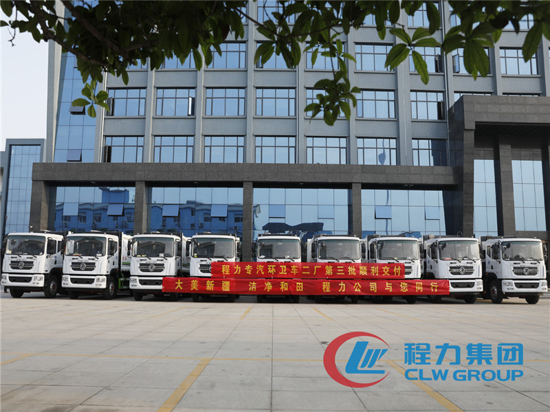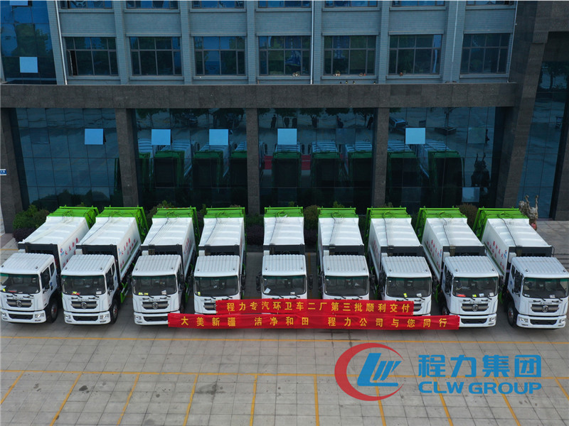 湖北程力批量環衛垃圾車壓縮垃圾車發車圖片,東風14方壓縮垃圾車批量發往新疆