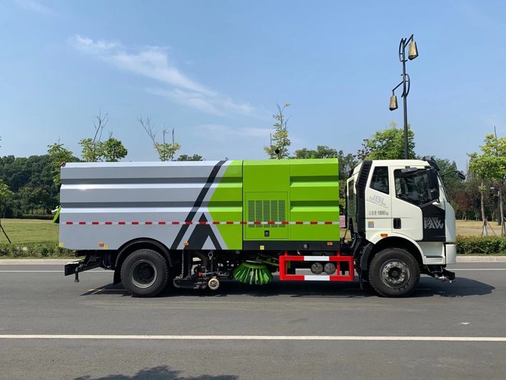 帶2個中置掃盤;中置超寬吸嘴;雙層吸塵筒; 康明斯170馬力副發動機;臺灣液壓閥;大力馬達;德國高壓水泵 (前沖/側噴/中噴/后噴霧)/側沖洗水槍/垃圾箱自潔裝置); 萬向高壓路沿清洗;威龍低壓泵(前沖),氣動球閥控制; 4mm不銹鋼垃圾箱;不銹鋼水箱;德國控制器;尾部箭頭燈; 機油、垃圾箱、水箱均帶防溢或低位報警裝置;倒車及洗掃狀態室內監視器; 多種語音提示;倒車自動保護、防傾倒垃圾翻車保護、檢修安全保護; 20m高壓沖洗卷盤;刷臂轉動機構使用德國進口高新耐磨工程隔套,免打黃油; 冷彎無縫液壓油管;運動控制器一鍵電腦控制。洗掃寬度3.5m;吸入粒度p110mm。 湖北程力國六解放洗掃車多方位圖片: