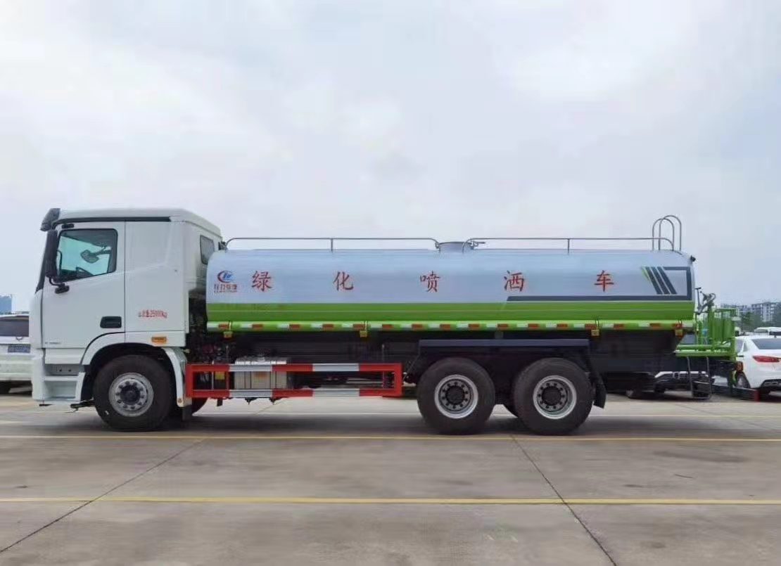 湖北程力國六歐曼后雙橋18-20方綠化噴灑車(灑水車)程力威牌CLW5250GPSBDP型綠化噴灑車廠家配置: 湖北程力國六福田歐曼GTL后雙橋20噸灑水車底盤配置:采用福田歐曼后雙橋原裝底盤,福田歐曼GTL豪華駕駛室,4400+1350mm軸距,搭載國六(國Ⅵ)東風康明斯260馬力柴油發動機,功率191kw,國六排放,陜齒法士特八檔變速箱,11.00R20鋼絲胎,前橋5T,后橋雙10T,方向助力,斷氣剎,排氣制動,原裝空調,行駛記錄儀,多媒體顯示屏,電動門窗,中控鎖,氣囊座椅,ABS。 湖北程力國六福田歐曼GTL后雙橋20方灑水車專用配置:罐體容積:18立方米,罐體鋼板為5mm碳鋼Q235材質專用容積板一次成型,罐內隔板具有防波作用,以減輕汽車行駛時罐體液體沖擊;配大功率專用灑水泵,泵可自吸自排;整車前沖、后灑、側噴、后平臺帶綠化灑水炮,灑水炮可全方位旋轉,可連續調成直沖狀、大雨、小雨、毛毛雨;前封頭帶水位計,后平臺主管路帶1寸澆花接口,后爬梯,帶1個消防接頭,帶1個自流閥,1個過濾裝置。